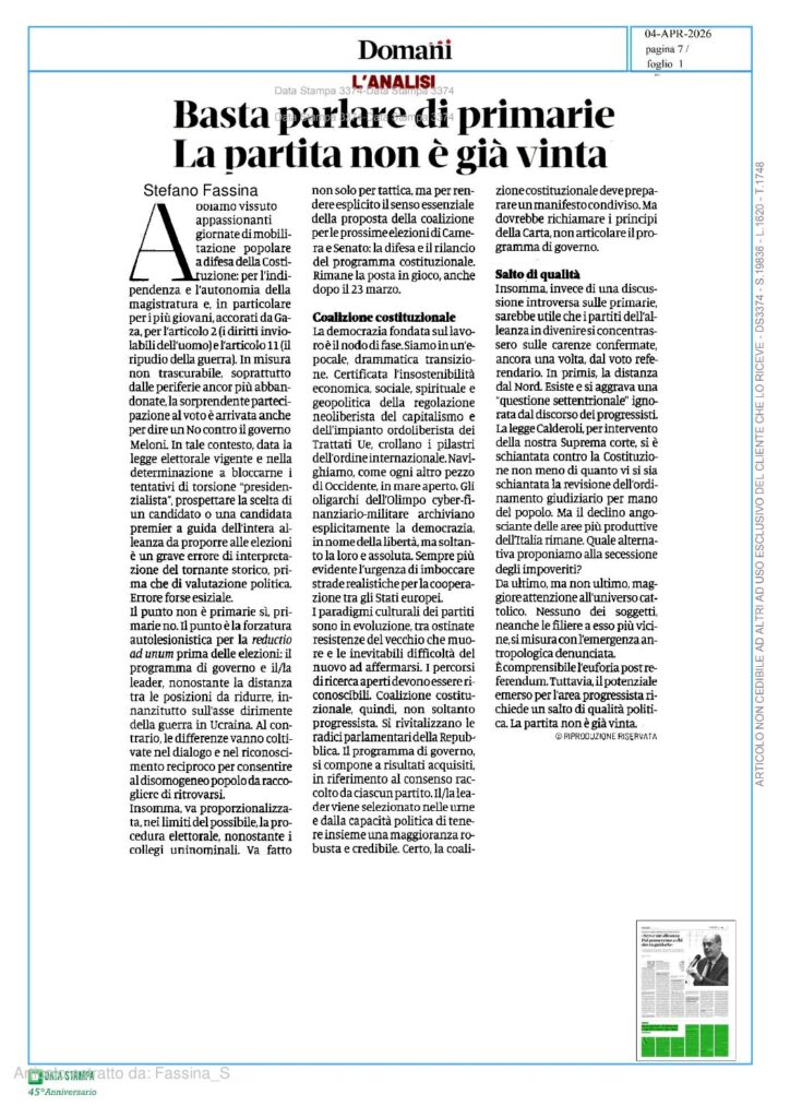 “Basta parlare di primarie. La partita non è già vinta”, intervento di Stefano Fassina su Il Domani del 4 aprile 2026.